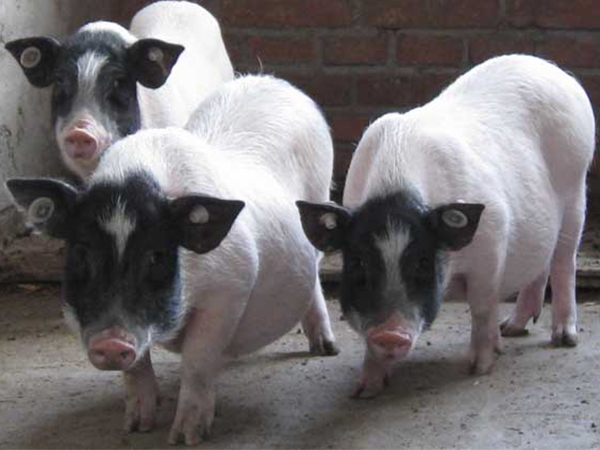 巴馬香豬,個體矮、小、短、圓,性野早熟。外貌顏色特征主要表現(xiàn)為兩頭黑、中間白,部分個體背腰部稍帶黑斑,額頭有白線或倒三角型白斑,俗稱“兩頭烏”。